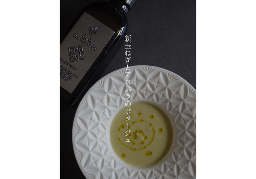 今回は、アルベキーナを使った『新玉ねぎとアスパラのポタージュ』です。